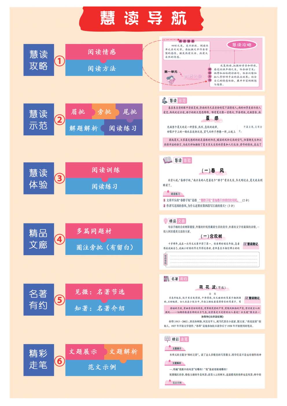 《隨堂慧讀》依靠教材的體例,首創“六位一體”閱讀法:①慧讀攻略→ ②慧讀示范 → ③慧讀體驗 → ④精品文廊 → ⑤名著有約 →⑥ 精彩走筆。